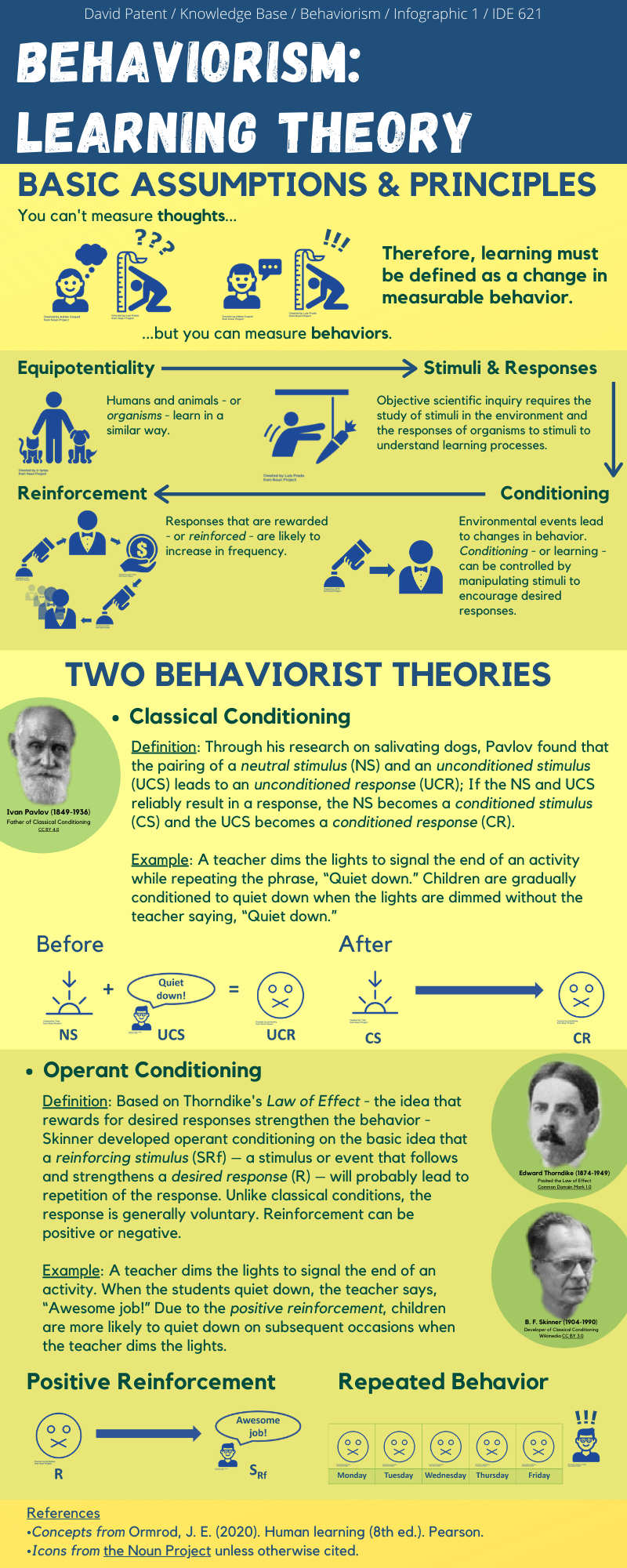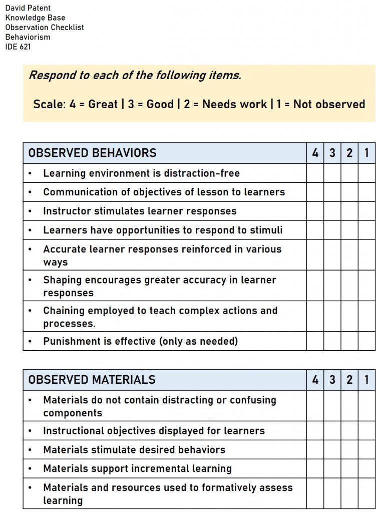 Nevertheless, from the readings, videos, and classroom work we have done related to behaviorism, it has clearly had profound effects on how we understand measurements and processes of learning. First, regarding measurement, the development of instructional objectives including an action verb that focuses on what learners should be able to do (rather than on what they should know or understand) is a key aspect of designing effective instruction. Second, with respect to processes, the concept of shaping – or incremental progress towards proficiency – is key to successful instructional strategy.